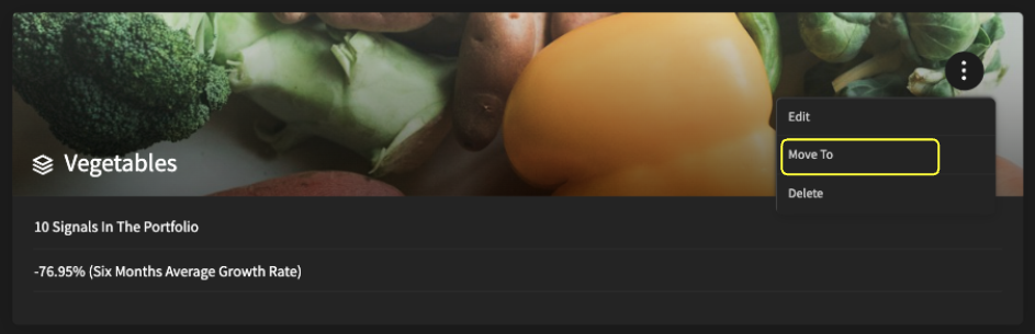 To add a Portfolio to a folder, go to the three dots on the upper right hand corner of a portfolio, and then select the “Move to” button.