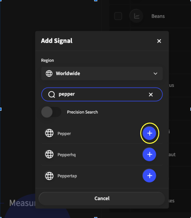 Once you have found your chosen signal, you can add it by pressing the “+” button (highlighted in yellow).