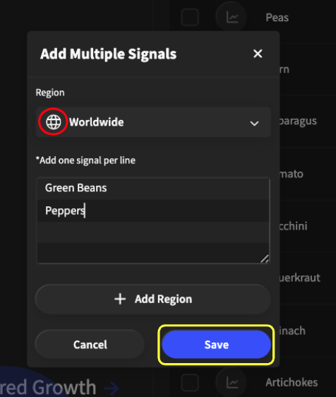 You will be able to add signals line by line and when you are finished, click the “Save” button (highlighted in yellow). The globe icon (highlighted in red) will allow you to change the market of the signals.