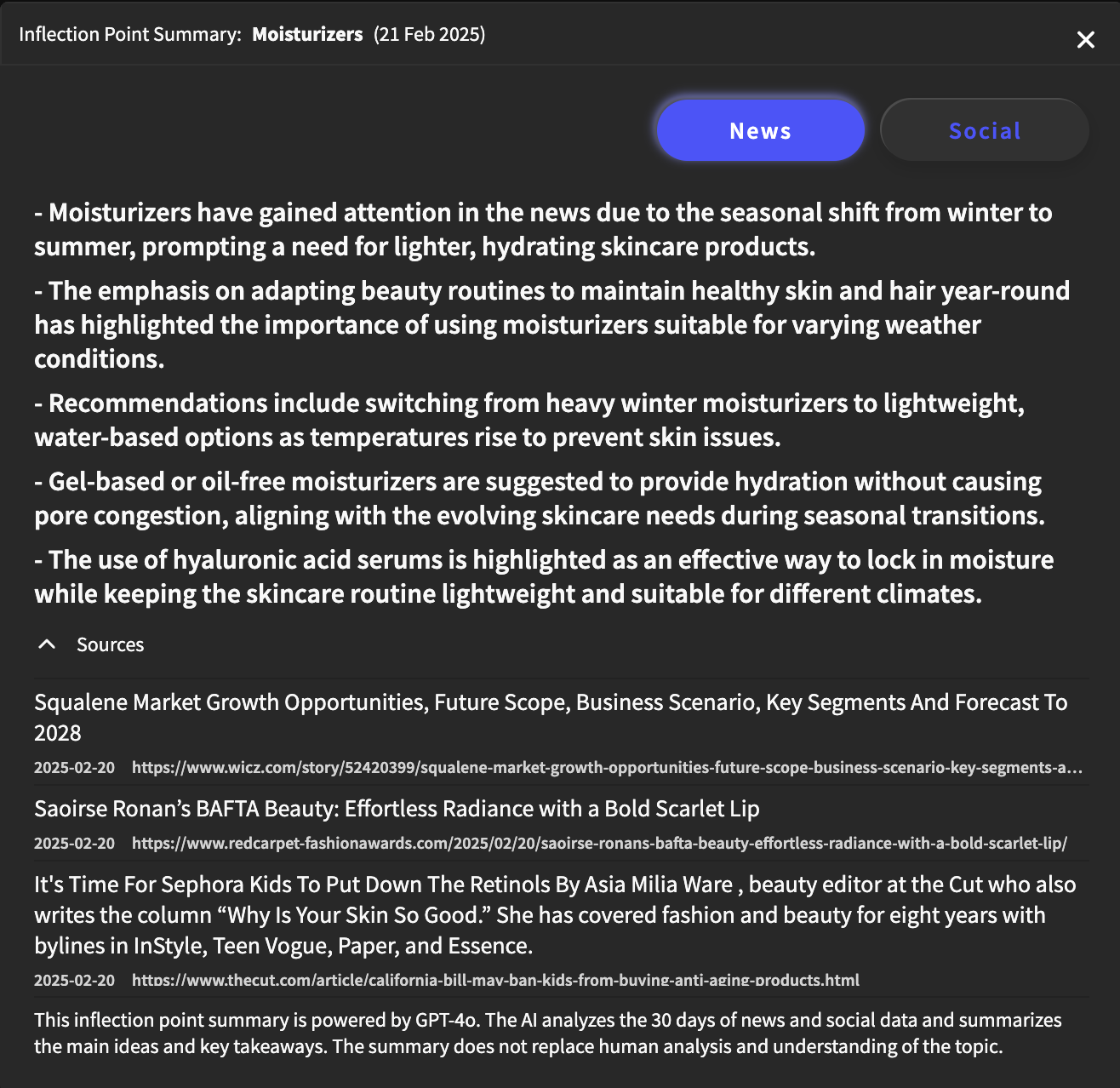 Inflection Point Summaries, powered by GPT-4o, analyze the last two weeks of news and social data to generate a summary of the main ideas and key takeaways.